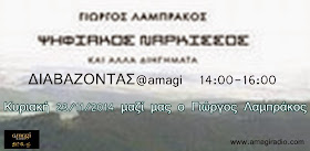 Το βιβλίο είναι ολοκαίνουργιο και λαχταριστό, χθες έγινε η πρώτη παρουσίαση με μεγάλη επιτυχία, ο Γιώργος Λαμπράκος από τους πιο ενδιαφέροντες νέους λογοτέχνες μας, κληρώνουμε και 3 αντίτυπα του Ψηφιακού Νάρκισσου, ευγενική προσφορά των εκδόσεων Γαβριηλίδης. Τι άλλο να θέλει κανείς ένα χειμωνιάτικο μεσημέρι Κυριακής. (Έλα τώρα που θέλετε να πάτε σε οικογενειακό τραπέζι, δεν το πιστεύω...)